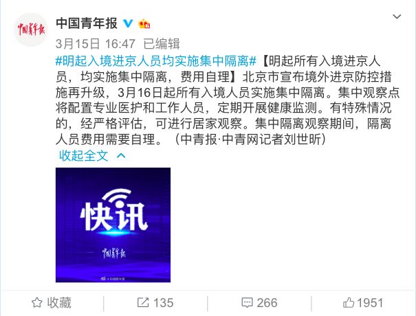 北京市宣布境外进京防控措施再升级,3月16日起所有入境人员实施集中隔离。集中观察点将配置专业医护和工作人员,定期开展健康监测。有特殊情况的,经严格评估,可进行居家观察。集中隔离观察期间,隔离人员费用需要自理。