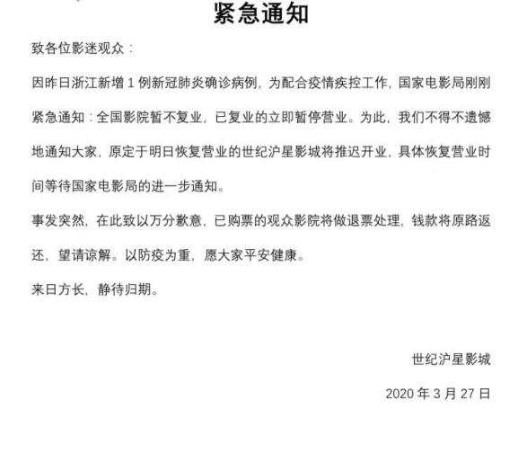 在一些城市影院陆续宣布复工的同时,3月27日晚,国家电影局紧急通知,所有影院暂不复业,已复业的立即暂停营业,具体复业时间需等待国家电影局通知。